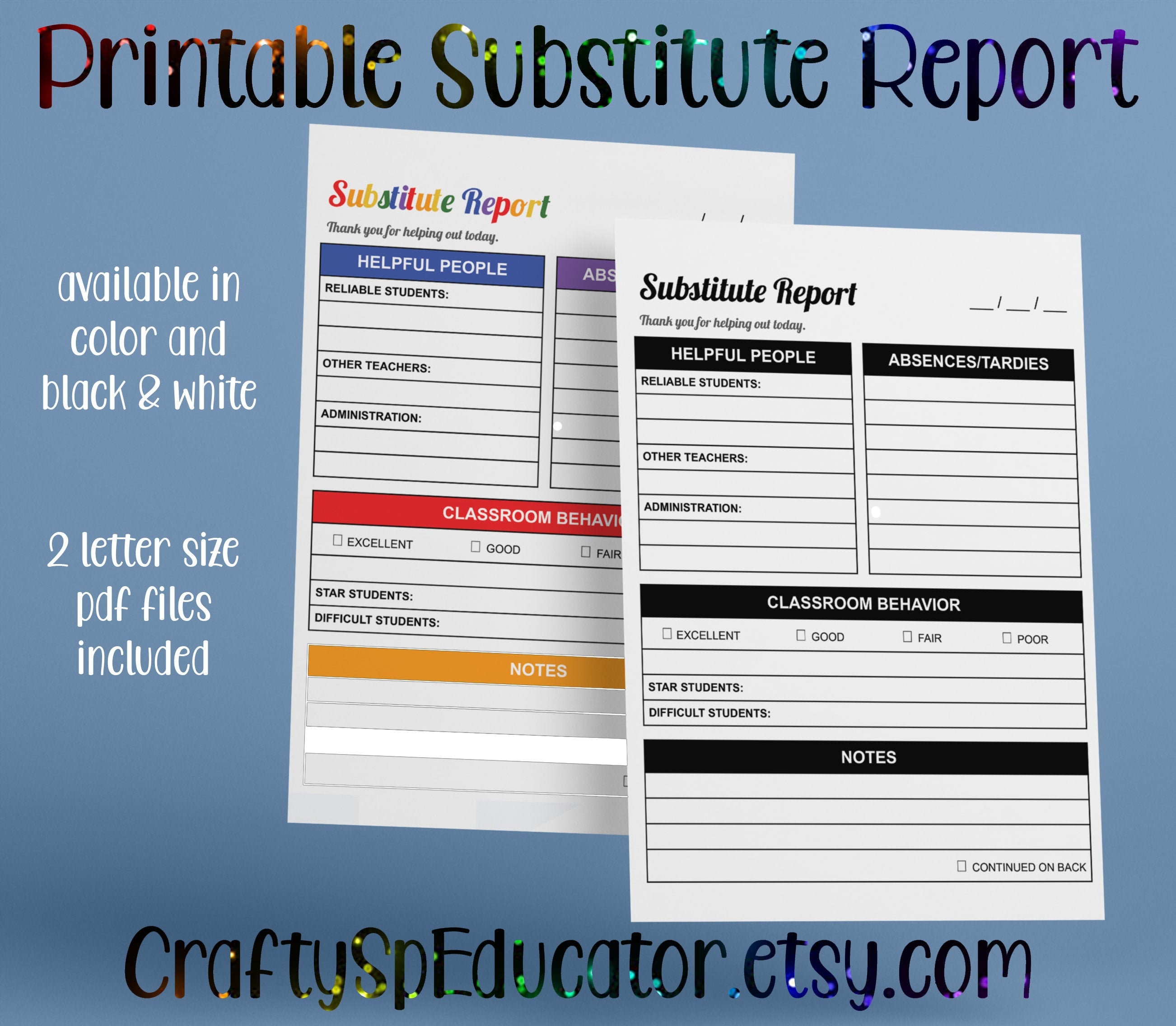 Substitute Teacher Report Notepad Printable Teacher Tools Etsy